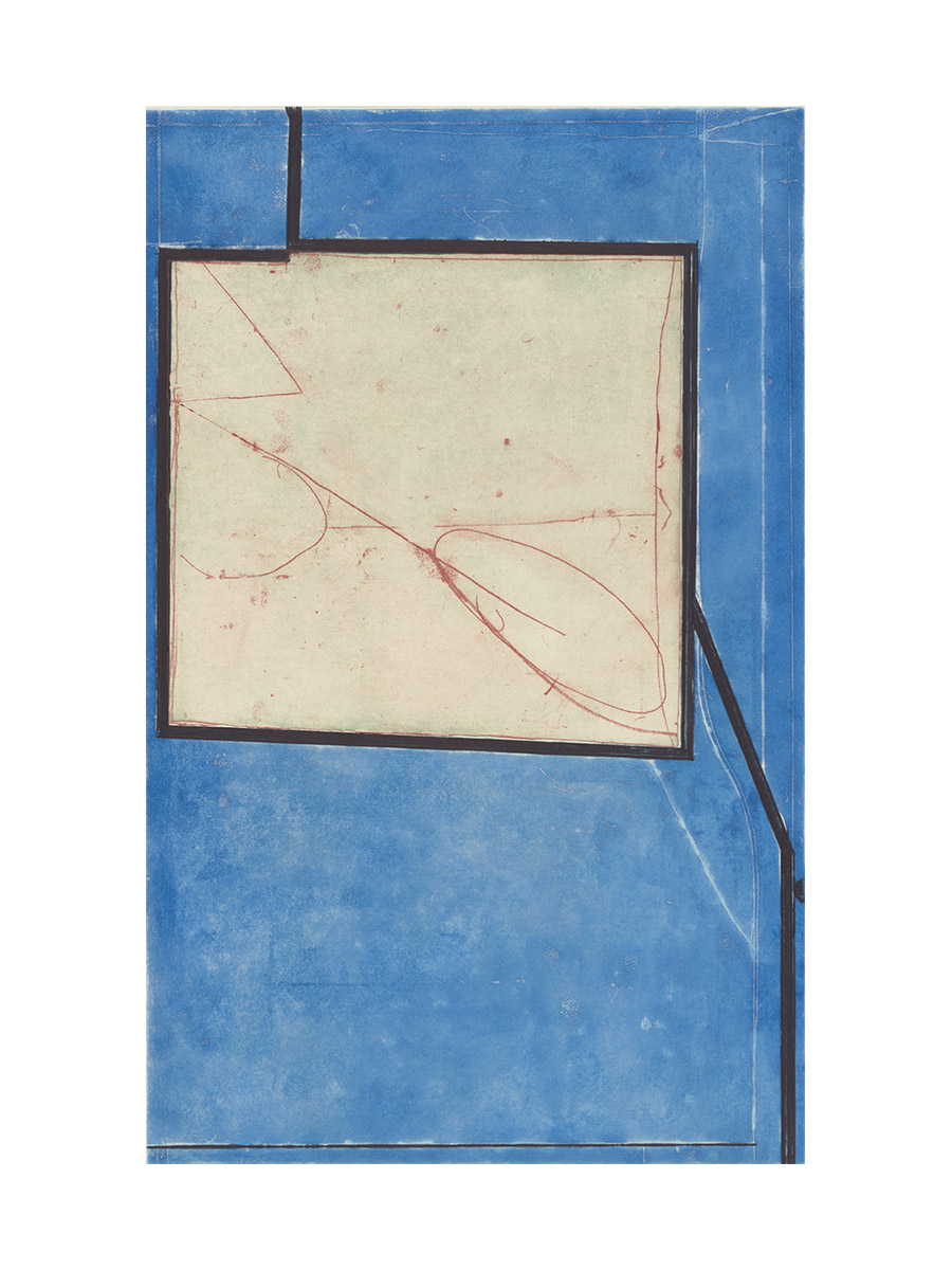 Aquatint reversal with hard ground etching and drypoint printed in black and blue.