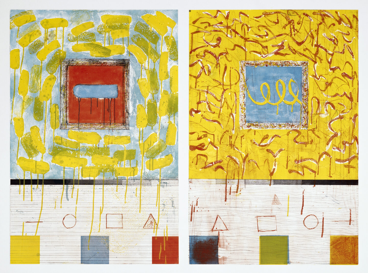 Color spit bite and sugar lift aquatints with aquatint, drypoint and hard ground and soft ground etching.