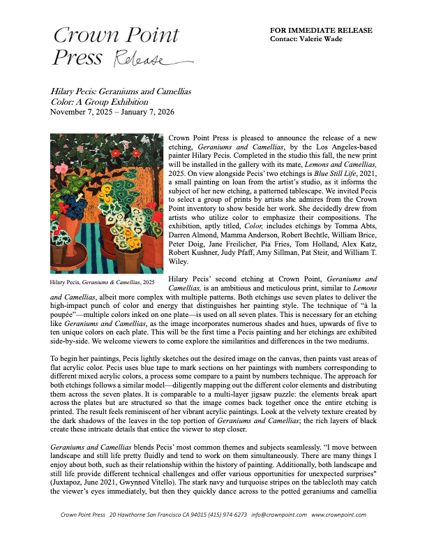 Stay up-to-date on Crown Point Press new print releases, exhibitions, news, and events.