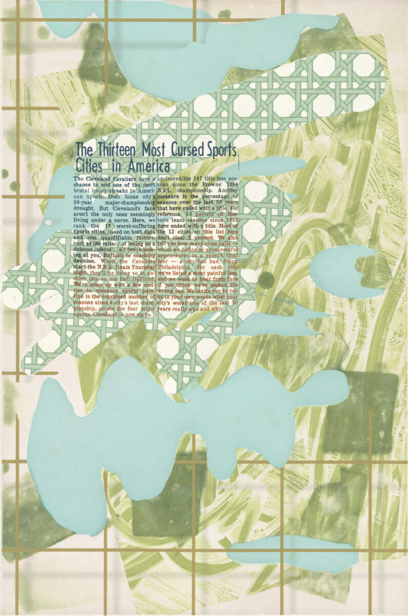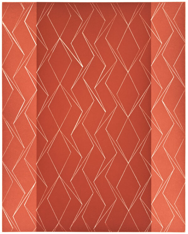 Color spit bite aquatint with aquatint, direct-to-plate aquatint, 2-color screenprint and bookcloth appliqué.