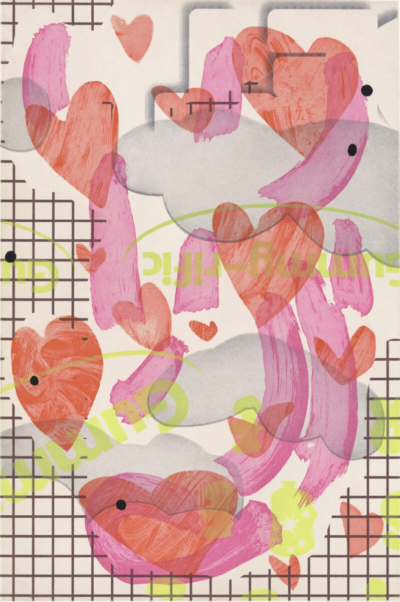 Color spit bite, sugar lift and soap ground aquatints with aquatint, direct-to-plate aquatint and 5-color screenprint.