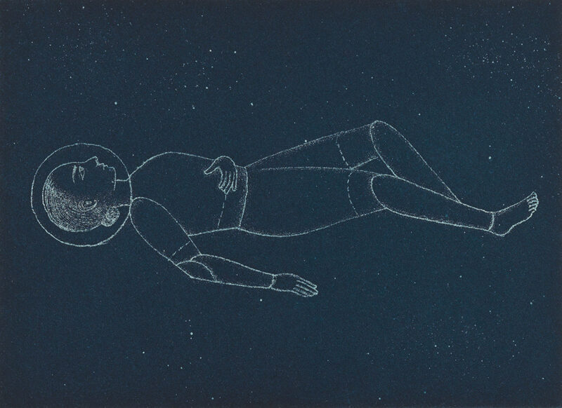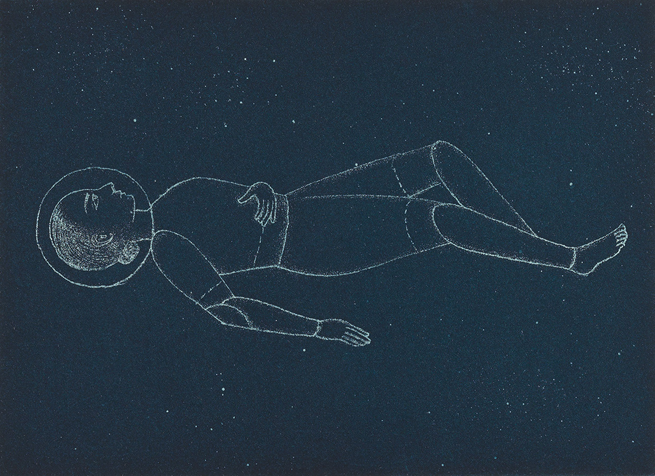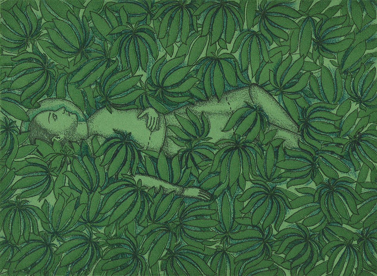Color sugar lift aquatint with hard ground etching and drypoint.