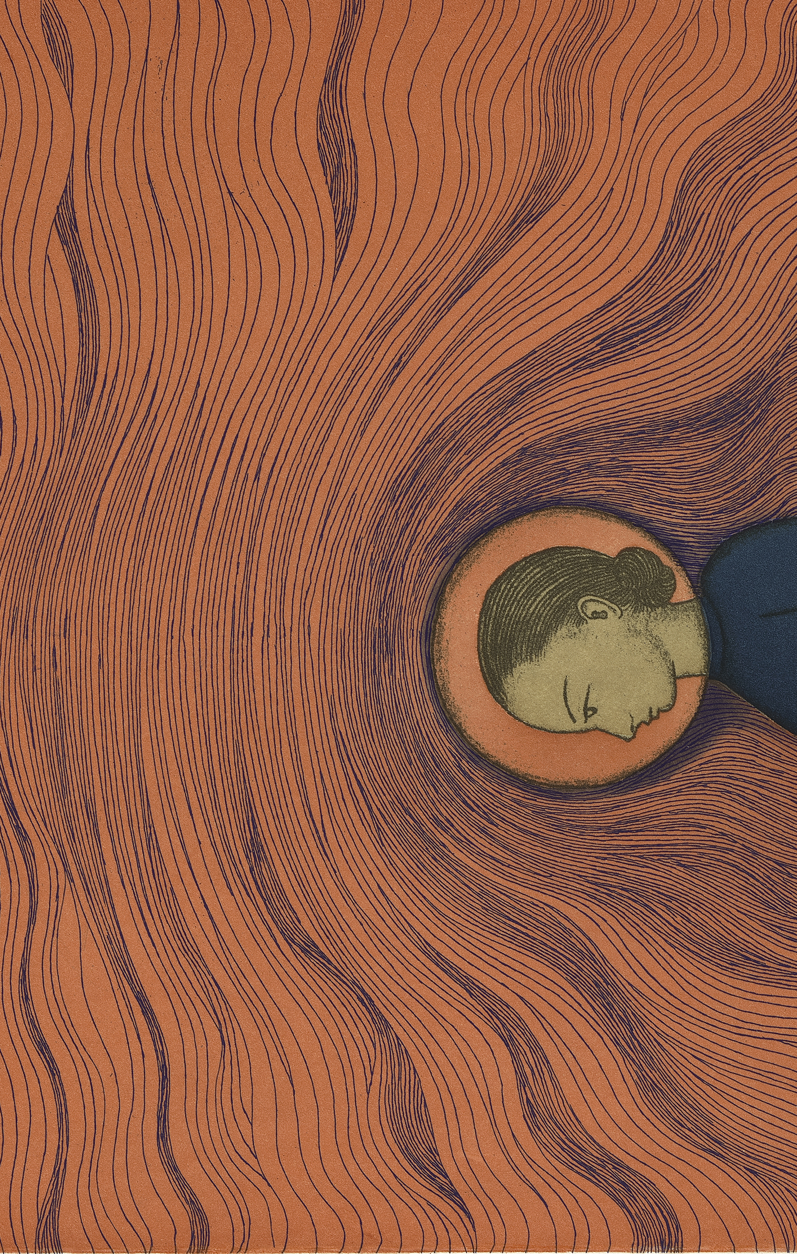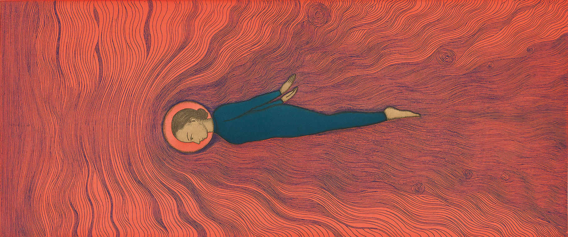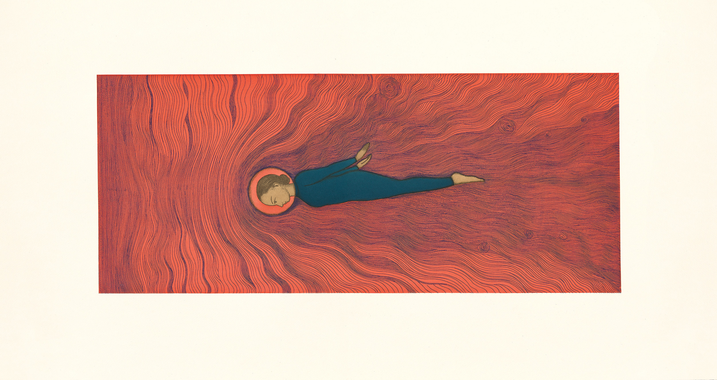 Color drypoint with spit bite and soap ground aquatints and aquatint printed on gampi paper chine collé.