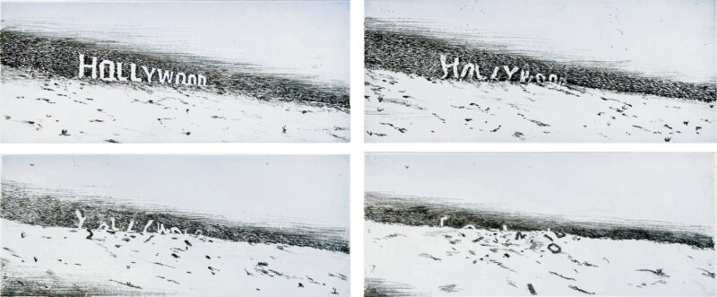 Aquatint with sugar lift aquatint and soft ground and hard ground etching printed in yellow and black.