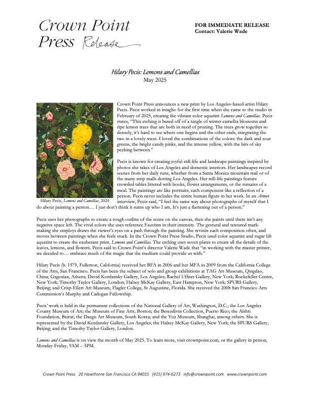 Crown Point Press will use the information you provide on this form to be in touch with you about new print releases, gallery exhibitions, art fairs, summer workshops, and other special events at or related to Crown Point Press.