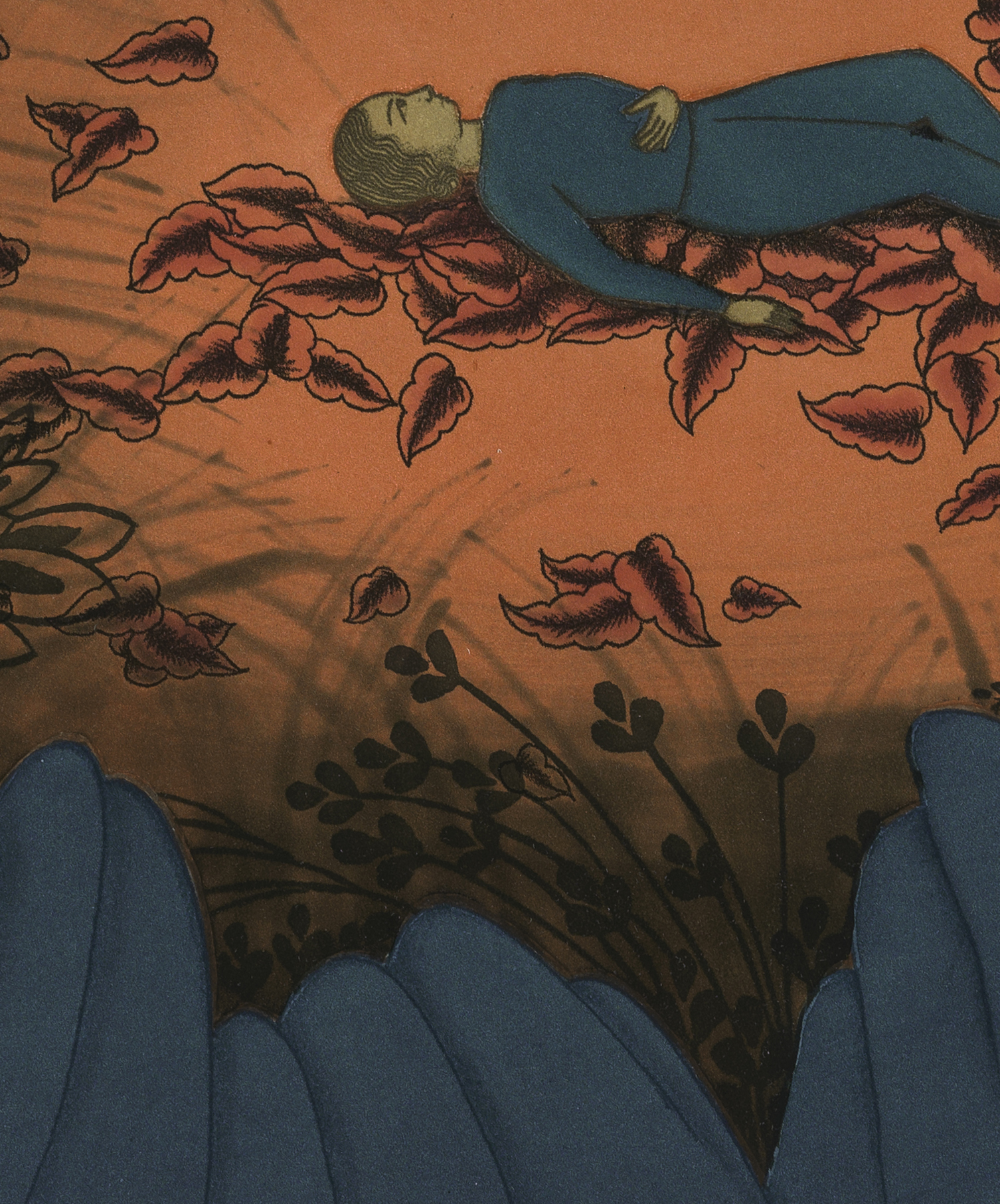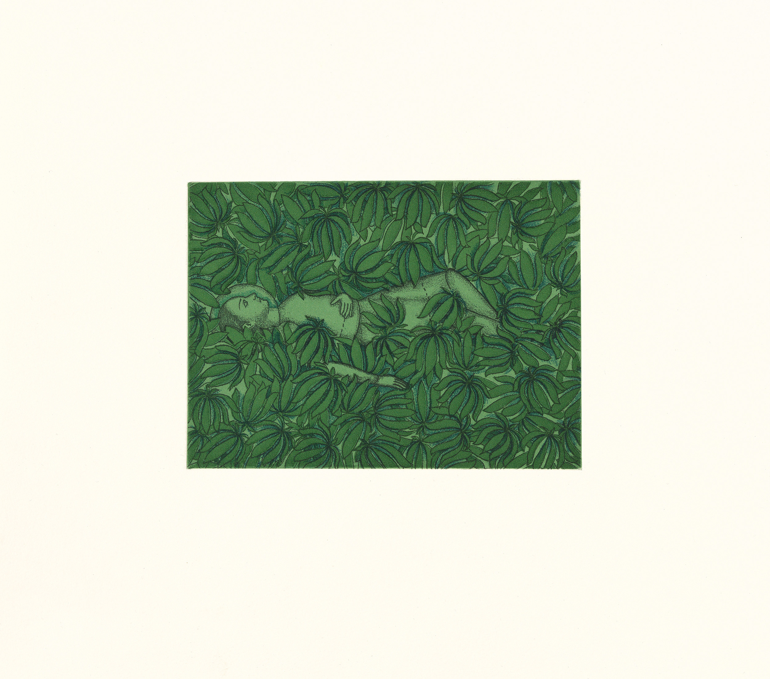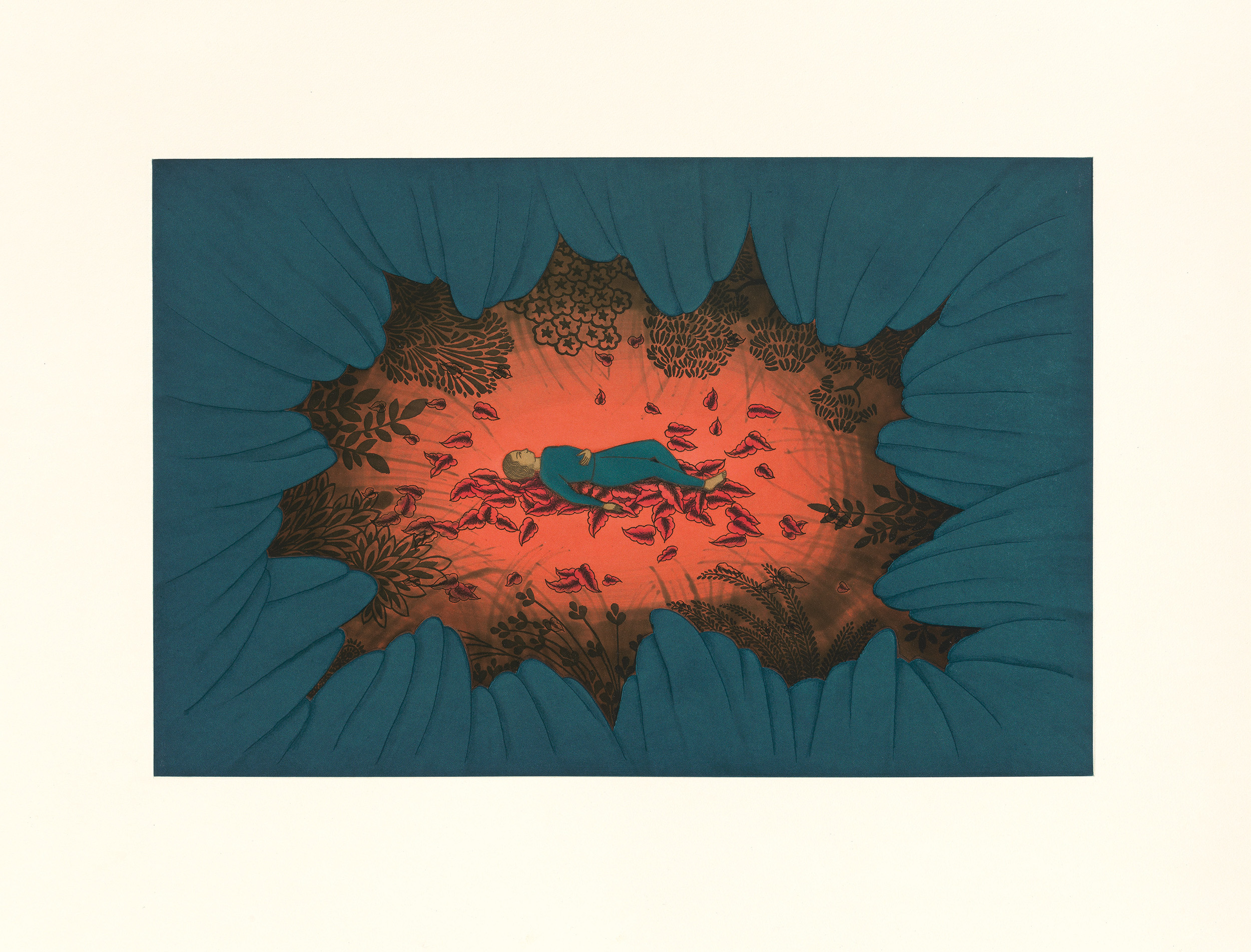 Color aquatint with sugar lift and spit bite aquatints and soft ground etching.