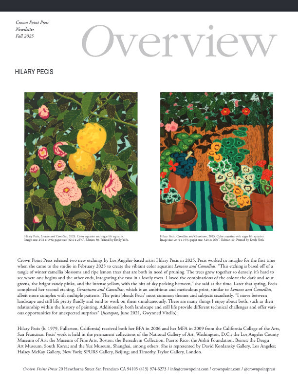 Overview announces our new print releases with color illustrations and an essay about the artist and the work.